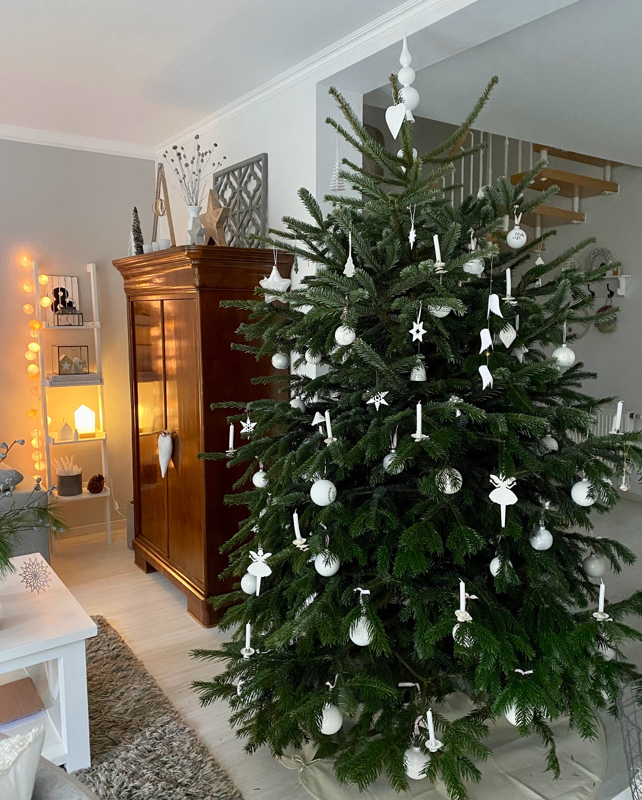 Einen wunderbaren eleganten Weihnachtsbaum habt ihr! Unserer steht seit Sonntag geschmückt in der Stube. Nach dem Anbringen von 200 Lichtern und über 200 Kugeln konnte ich aber auch nur noch auf der Couch umfallen und meinen schmerzenden Rücken pflegen. Was tut man nicht alles fürs Weihnachtsfeeling? *lach*
